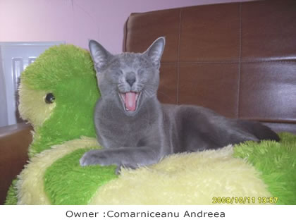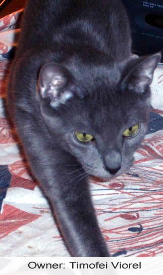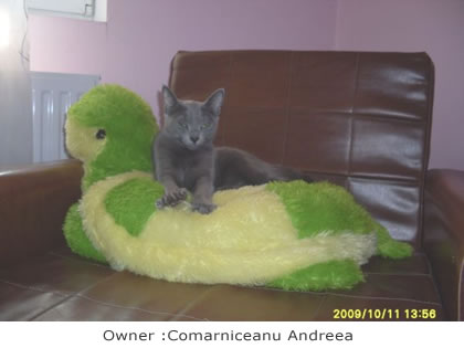 A wonderful girl, daughter of GIC YU* Singidunum Djina and CH RO* Cendre de Roses Emerald, two "VIPs" of the Russian Blue breed. I kept her in the cattery being positive that she'd bring a good contribution to the breeding progress. However, after her first period (which occured early, at 6 months of age) she was diagnosed with pyometra. She was neutered and she continued her joyful life. Her intense green eyes, the joy she spreads all around her, the playfulness, the innocence and the warmth of her personality are now bringing joy to a young and wonderful family... as wonderful as Noisette... my blue dream... |